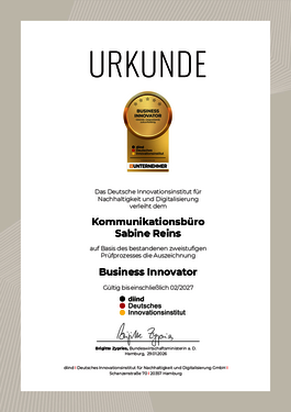 Das Deutsche Innovationsinstitut für Nachhaltigkeit und Digitalisierung verleiht dem Kommunikationsbüro Sabine Reins nach bestandenem zweistufigem Prüfprozess die Auszeichnung Business Innovator.